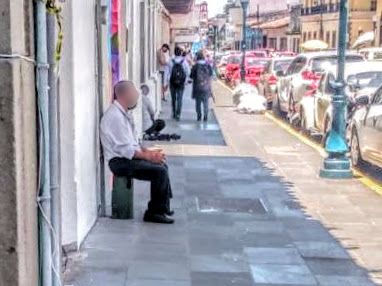 Dos personas piden limosna afuera de un banco. Ciudadanos se preguntan si ninguna institución de gobierno lleva a cabo acciones para hacerse cargo de este tema. Podrían inscribirlos a los Programas de Bienestar para recibir apoyo del gobierno federal y atender su situación. (La queja es muy respetuosa).